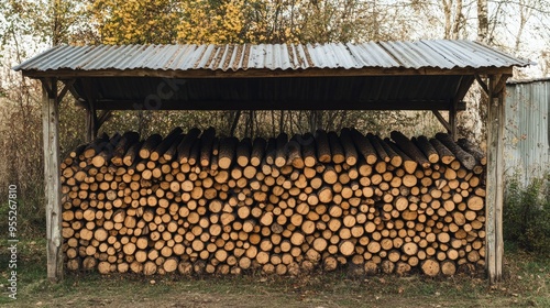 Stacked firewood neatly arranged under a tin roof, ready for winter, with a mix of split logs and round pieces, creating a practical and rustic scene