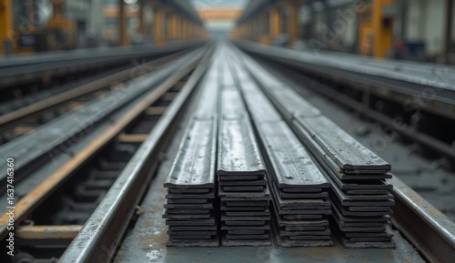 Stacked metal beams neatly arranged in an industrial warehouse. Perspective view highlights rows, depth, and scale. Metallic shine emphasizes efficient logistics and readiness for shipping