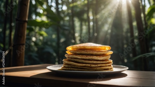forest, sunlight, breakfast, nature, food, stack, plate, morning, delicious, culinary, greenery, light, healthy, rustic, homemade, sirup, wood, calmness, vibrant, fresh, organic, lifestyle, cookery, picnic, meal, sweet, tasty, brunch, epicure, treat, scenery, savoury, simple, natural, enjoyment, warmth, leisure, environment, peaceful, inviting, aroma, texture, harmony, indulgence, relaxation, beauty