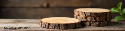 Stacked pine wood discs product display platform, rustic background , design, copy space