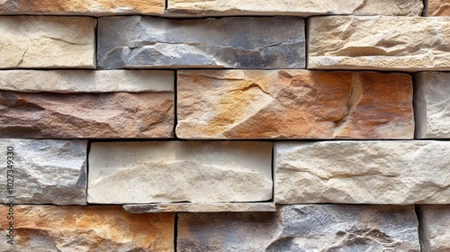 Stacked stone wall texture with multicolored natural stone facade, displaying earthy tones and rough surface details in a close-up view for an architectural context.