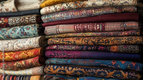 Stacked textiles in various hues, featuring detailed patterns and plush textures