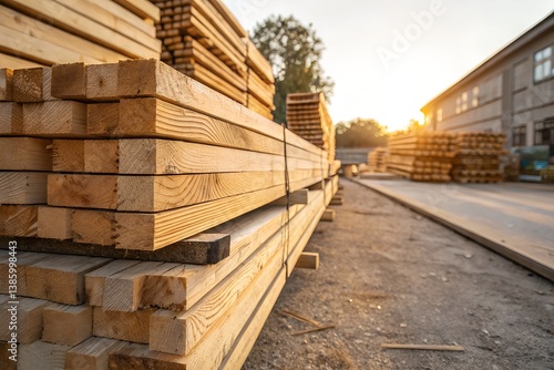 Stacked wood planks at Sunset , Construction Material Ready for Use