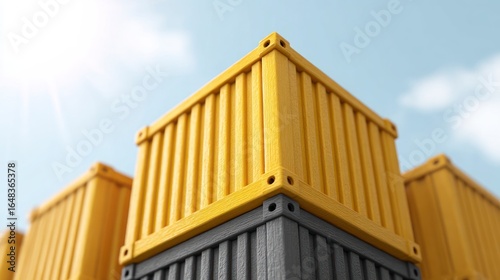 Stacked yellow and grey shipping containers under a bright sky cargo containers