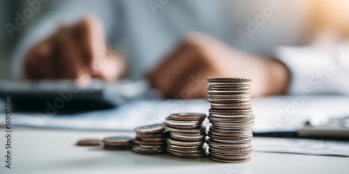 Stacks of coins arranged in ascending order with person calculating finances using calculator, concept for investment strategy, financial planning and wealth management
