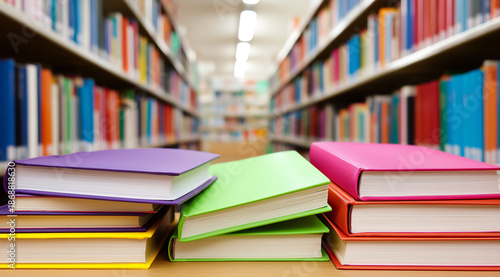Stacks of colorful books on a table in a library with blurred bookshelves