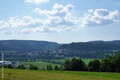 city, village, small, meadow, field, nature, summer, cloud, heaven, white, blue, green, weather, german, danube, forest, hill, mountain, rock