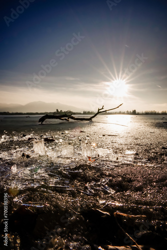 winter, see, sun, ice, sheet of ice, twig, tree, mount, bergsee, background image, mural, heaven, water, sunset, sunset, sunset, sunrise, countryside, nature, home, bavaria, seascape, ice-skate, danger, alpen, evening, winter landscape, season, weather, dusk, light, sunbeam, sunlight, lakeshore