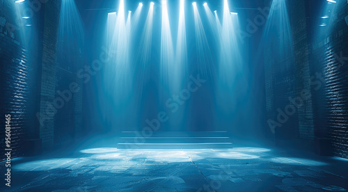 Stage lights backdrop with soft blue tones providing a calming and tranquil performance environment. Generative AI.