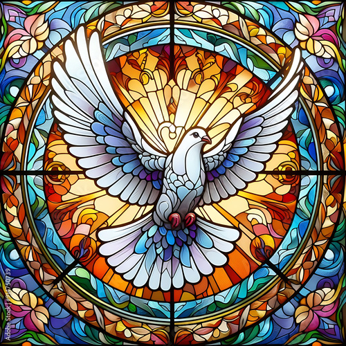 Stained Glass and Colourful Winged Dove. Illustration and representation of the New Testament Holy Spirit