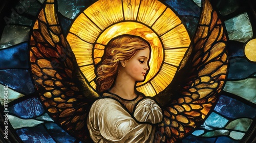 Stained glass angel window detail, religious art, golden halo, serene expression, intricate design.
