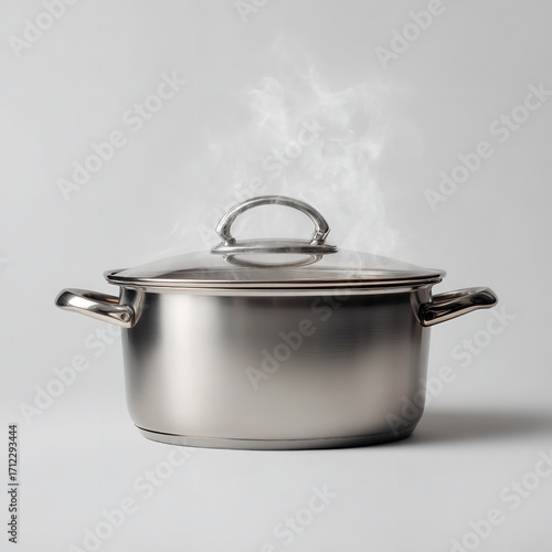 Stainless steel cooking pot with lid steaming on white background kitchenware cookware utensils food prep 100 char