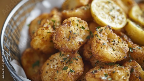 Stainless Steel Fry Basket with Handle Holding Crispy Fried Food and Lemon Slices Perfect for Culinary Presentation in Restaurants and Homes