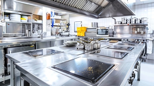kitchen, cooking, stainless, steel, countertop, stove, appliance, interior, eatery, commercial, oven, burner, chef, food, preparation, service, dining, catering, gastronomy, culinary, professional, industry, clean, modern, design, industrial, workspace, equipment, utensil, pan, pot, grill, metal, surface, shiny, silver, chrome, cleanliness, professionalism, workstation