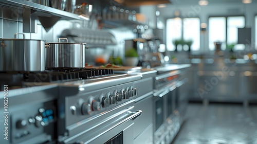 kitchen, stove, stainless, steel, oven, cookware, pot, range, appliance, cooking, utensil, burner, countertop, knob, control, handle, pan, gas, induction, cook, chef, eatery, commercial, industrial, modern, clean, professional, equipment, interior, design, space, white, grey, silver, glossy, shiny, metal, reflective, surface, light, shadow, depth, perspective, sharpened, blur