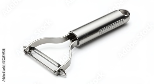 peeler, kitchen, tool, cooking, metal, stainless, steel, fruit, vegetable, food, cutting, preparation, isolated, equipment, utensil, hand-held, kitchen utensile, contraption, modern, simple, white, background, accessory, design, minimalist, utility, professional, commercial, contemporary