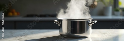 Stainless steel pot filled with flowing water and visible steam on a marble countertop, steam, stainless steel