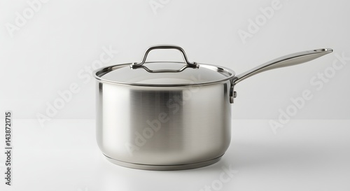 Stainless steel saucepan with lid, positioned at a slight angle on a white background