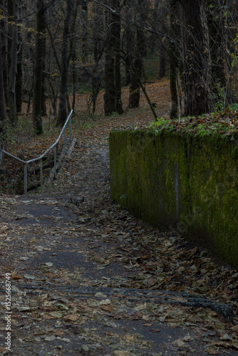 Staircase with green moss in concrete in a park in Vladikavkaz