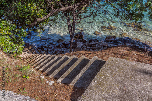 sea, stair, forest, path, nature, tree, tree, park, green, road, landscape, wood, wood, stone, pathway, step, trail, grass, ocean, croatia, spring, outdoors, summer, travel, vacation, holiday, mediterranean, europa, coast, shore, beach