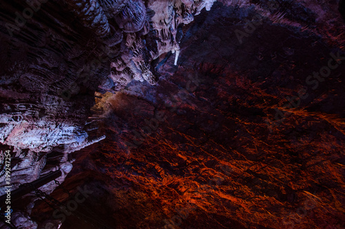 Stalagmites lit by colored lights, cave, Lozère, Occitanie, France