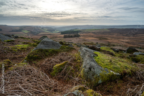 Stanage Edge Derbyshire Peak District bleak winter rural landscape.