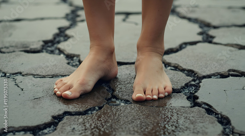 Standing Barefoot on Cracked Pavement Surface Outdoors