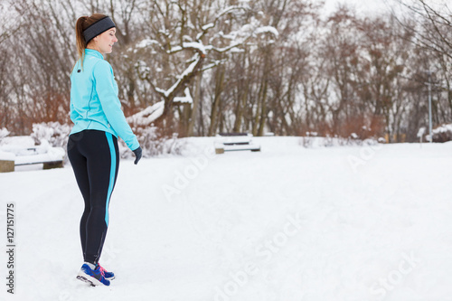 sport, woman, activewear, footwear, smile, female, winter, snow, activity, fitness, tree, park, health, forest, exercise, nature, fashion, physical exercise, fit, happy, cold, outside, lady, joy