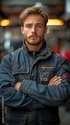 Standing in the garage of a car maintenance service centre, an attractive adult male mechanic wears a uniform, crosses his arms, and poses confidently.