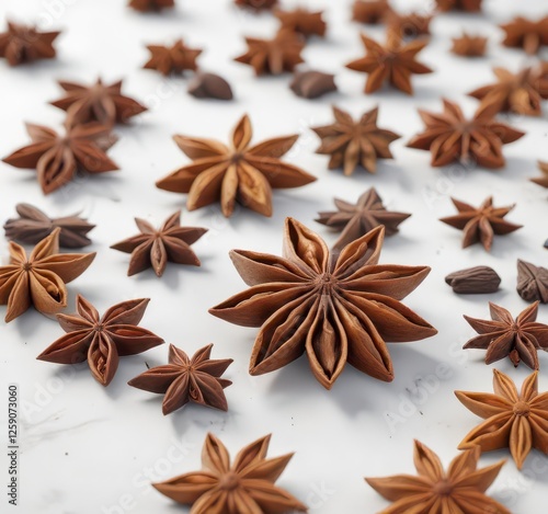Star anise seeds and whole star anise fruits on white surface, spice, fruits