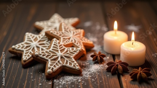 Star shaped ginger cookies lie on the table, illuminated by several small candles. Dark background. Image with selective focus.