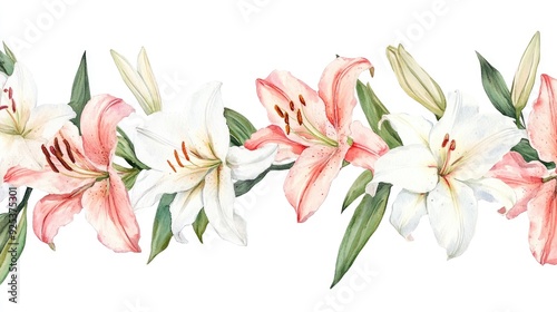 Stargazer Lilies. Watercolor Floral Garland Vignette with White and Pink Lilies