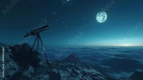 Stargazing Adventure: Telescope on Mountain Tripod, Capturing the Moon Amidst Galaxy Stars and Cozy Clouds