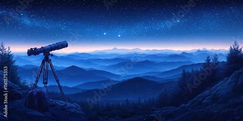 Stargazing on a clear night with a telescope overlooking a mountain range