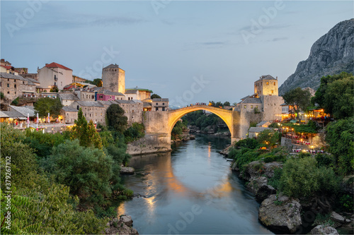 Stari Most bridge at twilight in old town of Mostar, BIH