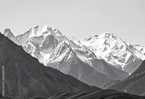 Stark, snow-capped peaks of a majestic mountain range in monochrome wilderness, monochrome, alpine