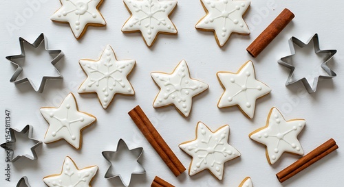 Starry Delights: Captivating overhead shot of meticulously decorated star-shaped cookies and cinnamon sticks, evoking a sense of warmth, festive joy, and culinary artistry.
