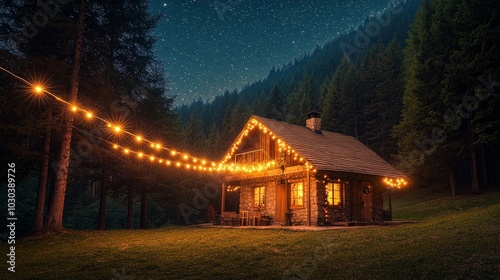 christmas, light, bungalow, forest, roof, tree, magical, starry, sky, warm, winter, cosy, holiday, decoration, festive, peaceful, outdoors, night, photo, ambient, light, high, iso, dark, moody, long, exposure, low, panorama, wide, banner, title, landscape, horizontal, hero, background, desktop, wallpaper