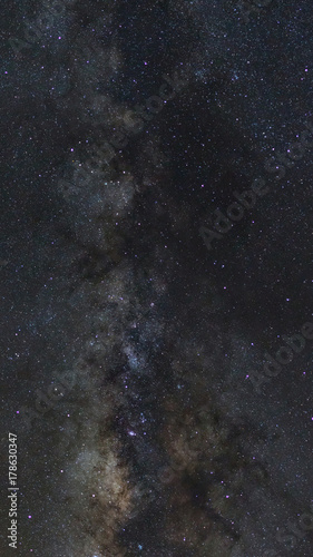 Starry night sky, Panorama Milky way galaxy with stars and space dust in the universe, Long exposure photograph, with grain.