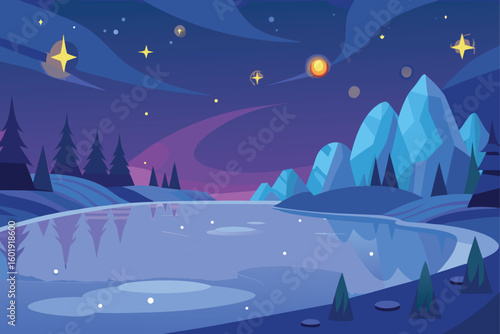 Starry Winter Night with Frozen River Vector