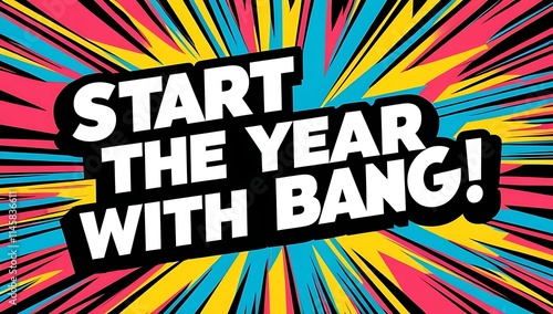 start, year, bang, colourful, announcement, vibrant, explosive, energetic, dynamic, new, beginning, fresh, motivation, inspiration, success, achievement, goal, aspiration, optimism, positive, future, progress, growth, opportunity, celebration, party, excitement, thrill, energy, power, impact, action, movement, speed, fast, bold, graphic, design, illustration, comic, pop, art