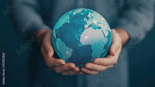 startup growth customers development concept. Hands holding a digital globe with a blue and green design.