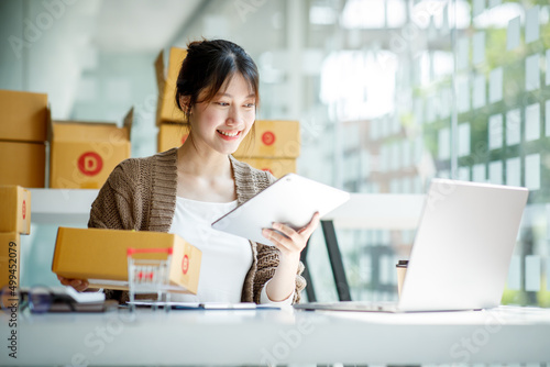 Startup small business entrepreneur SME or freelance Young Asian woman using a laptop computer with box, successful Asian woman working, online marketing packaging delivery, SME online business ideas.