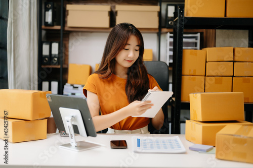 Startup small business SME, Entrepreneur owner woman using smartphone or tablet taking receive and checking online purchase shopping order to preparing pack product box. .