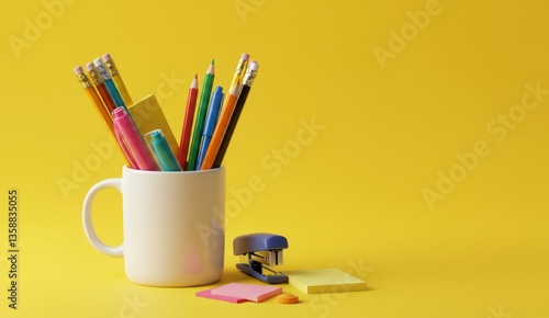 stationery, office, school, supply, desk, pen, stapler, note, post-it note, mug, container, yellow, vibrant, bright, workspace, education, back to school, creative, writing, drawing, organise, cup, still life, colourful