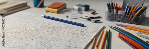 crayons, paper, school, pen, drawing, education, business, office, notebook, equipment, colours, yellow, supply, art, book, construction, paint, home, wax crayons, plan, tool, design, ruler, house, blueprint