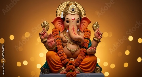 ganesh, hindu, deity, god, statue, religion, culture, india, elephant, gold, idol, orange, spirituality, worship, ganesh, festival, traditional, art, blessing, background, bokeh, light, celebration, faith, symbol, auspicious, prosperity, peace, happy, lord, divine, wisdom, remover, obstacle, colourful, decor, ornate, sculpture, closeup, detail, vibrant, garland, seated, pose, meditation, calm