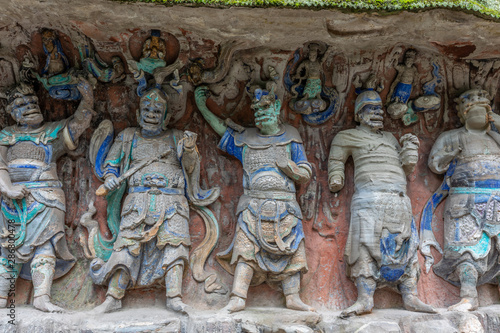 Statues of Buddhist guardian worriers in a cave at Dazu Rock Carvings at Mount Baoding or Baodingshan in Dazu, Chongqing, China. UNESCO World Heritage Site.