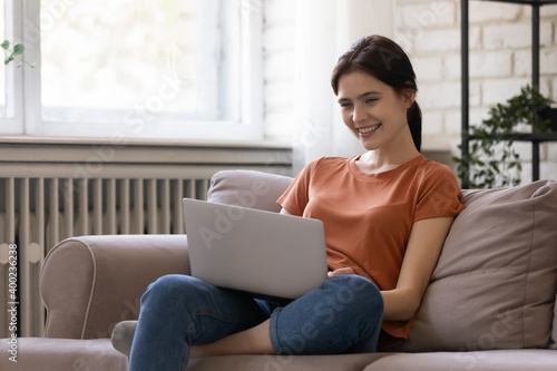 Stay at home. Smiling confident young woman remote worker spending time indoors at quarantine period doing job on pc. Female student communicating with friend by video call app on laptop study online