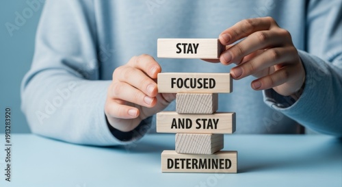Stay Focused and Determined: Building Success with Wooden Blocks, Illustrating Motivation and Achievement